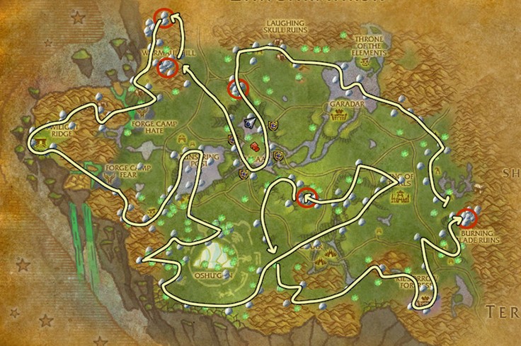 Nagrand is one of the best places to farm Adamantite Ore because of all the caves (marked with red circles). The mobs in the caves are easy to kill and the caves are not that big, so it's usually worth going inside.