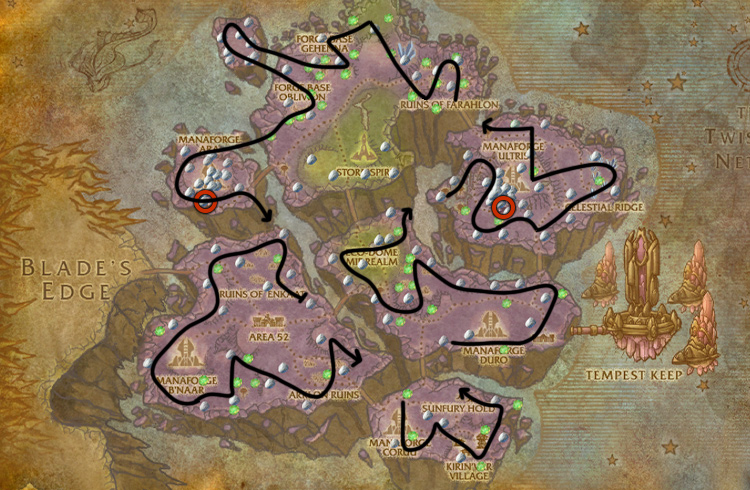 Netherstorm is also an excellent place to farm Adamantite Ore. Just like in Nagrand, I marked the caves with red circles on the map. But, you should only go inside if you have stealth or if there is a lot of other people farming in the zone. These are much bigger than the Nagrand caves, and the mobs are a lot higher level. (maybe with good gear it's worth clearing them)