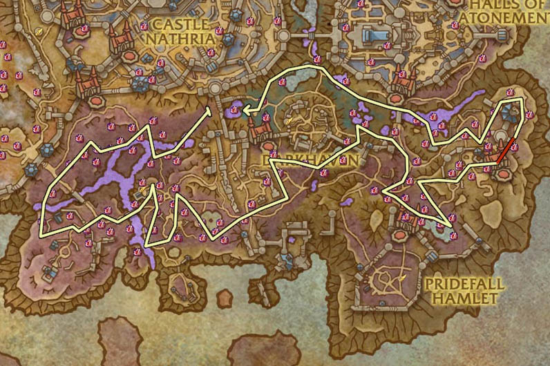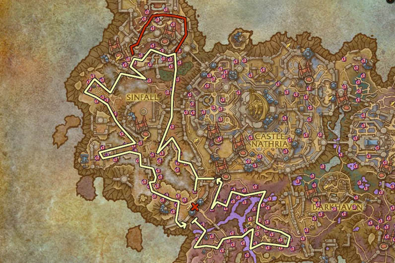 This is also a good route, but I got a bit fewer herbs overall. The red line is filled with elites, you should only go there if you have a tanking spec AND also a way to gather herbs while mounted. But even then you might die, so I usually just recommend skipping that part. There are also elites in the lower part that area, but they are much easier to avoid.