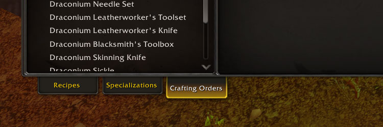 Clicking on the Crafting Orders tab at the bottom of your profession window will open the Crafting Order UI, where you can browse Crafting Orders posted by other players. You must be near a Crafting Table for your profession to access Crafting Orders.