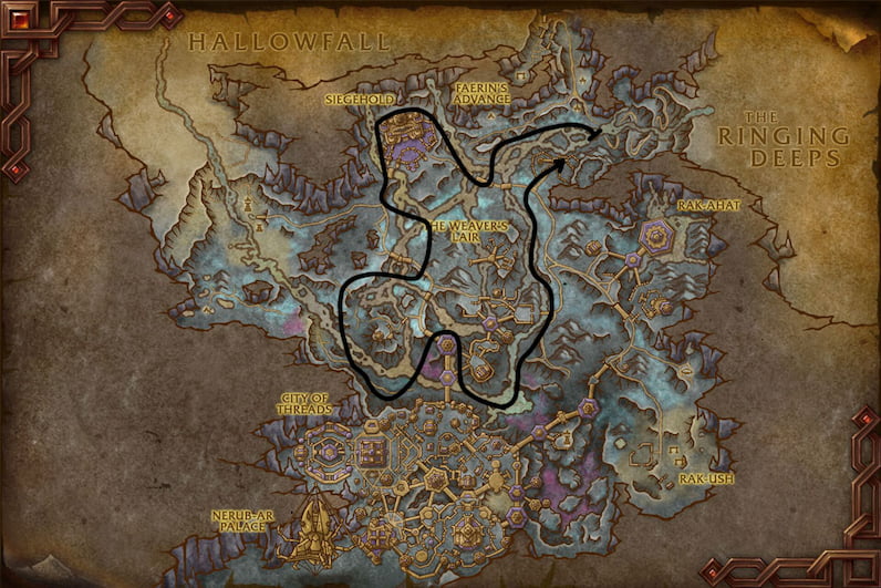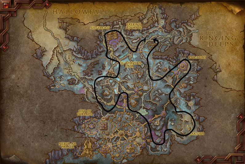 I primarily used these two routes in Azj-Kahet. Route 1 is shorter, while Route 2 covers most of the zone. I'd suggest avoiding the area leading to Hallowfall—it can be frustrating due to the vertical movement, making it hard to find nodes. However, the upside is that you might encounter less competition there.